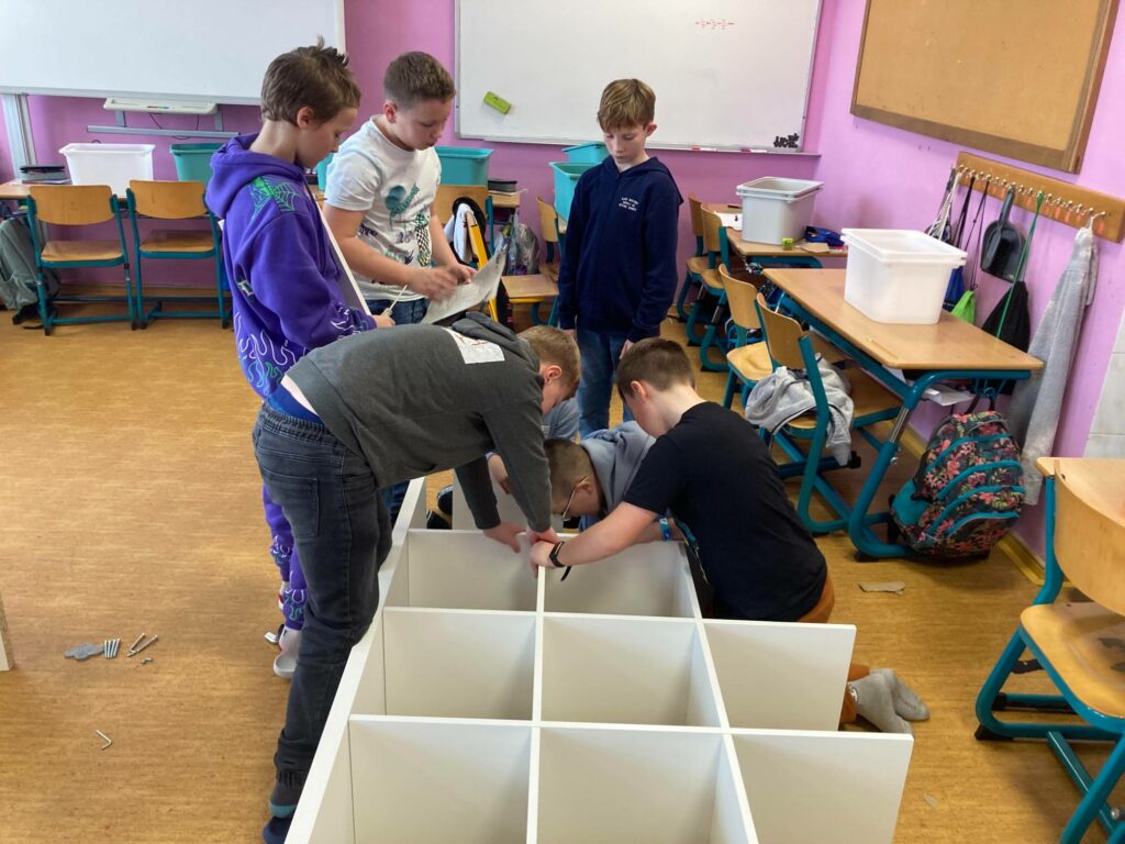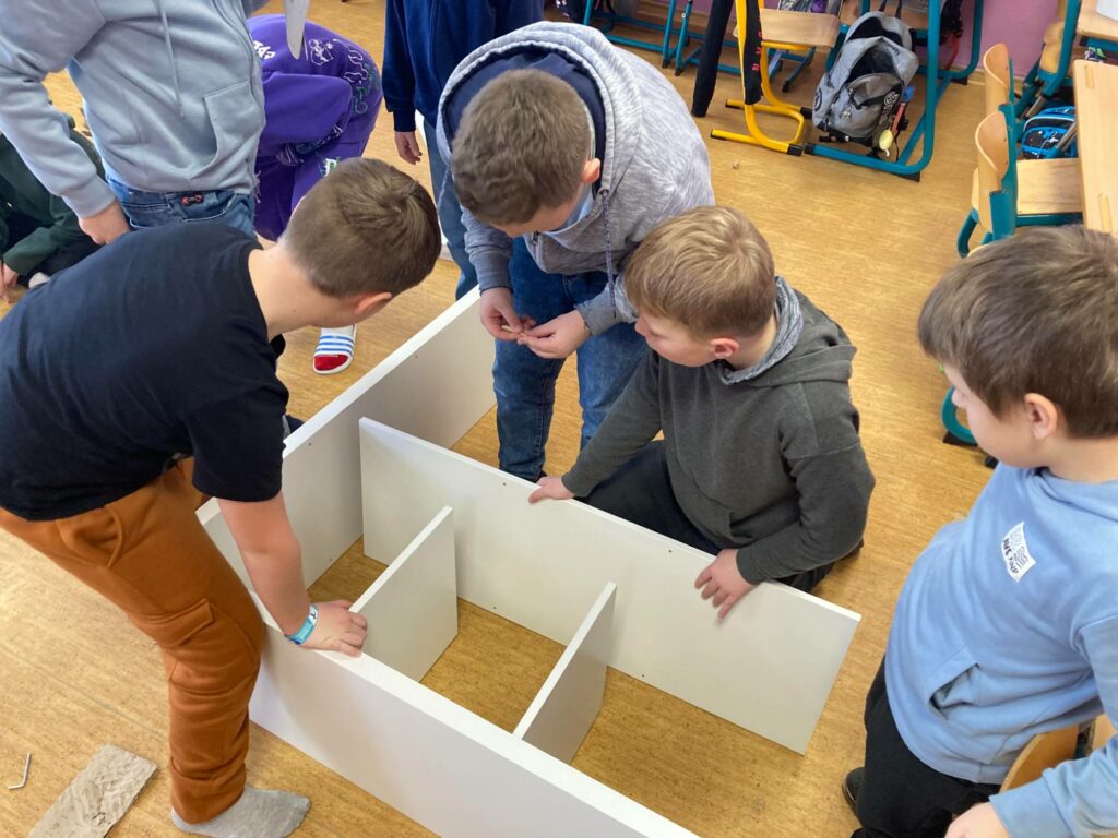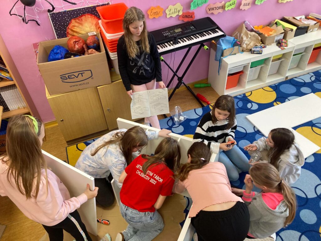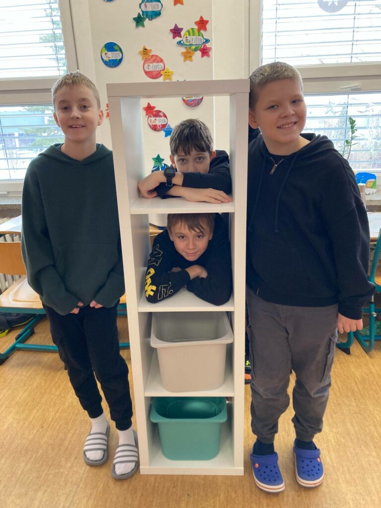 Žáci 5. třídy se konečně dočkali odměny za 3. místo v soutěži Zažij vesmír. Návody létaly vzduchem, šroubky cinkaly, padaly různé rady, jak na to. Nakonec se všem skupinkám podařilo svůj policový díl sestavit bez komplikací a výsledek vypadá skvěle.